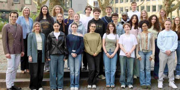 Im März begrüßten Projektleiter Bodo Kalveram (links) von der EWG und Katja Urselmann (2. v. links), Geschäftsstellenleiterin des Weiterbildungsinstituts WbI, die diesjährigen Stipendiatinnen und Stipendiaten im WbI Essen am Kennedyplatz. Unter der Leitung von WbI-Coach Janine Hünten (3. v. links) erhalten die 35 Teilnehmenden dort eine zweitägige, praxisorientierte Vorbereitung auf ihren Auslandseinsatz. Im Mittelpunkt stehen interaktive Übungen zu Kommunikation, interkultureller Kompetenz und souveränem Auftreten. Durch Rollenspiele, Gruppenarbeiten und Reflexionsphasen stärken die Jugendlichen ihre Fähigkeiten für erfolgreiche Begegnungen im internationalen Arbeitsumfeld.