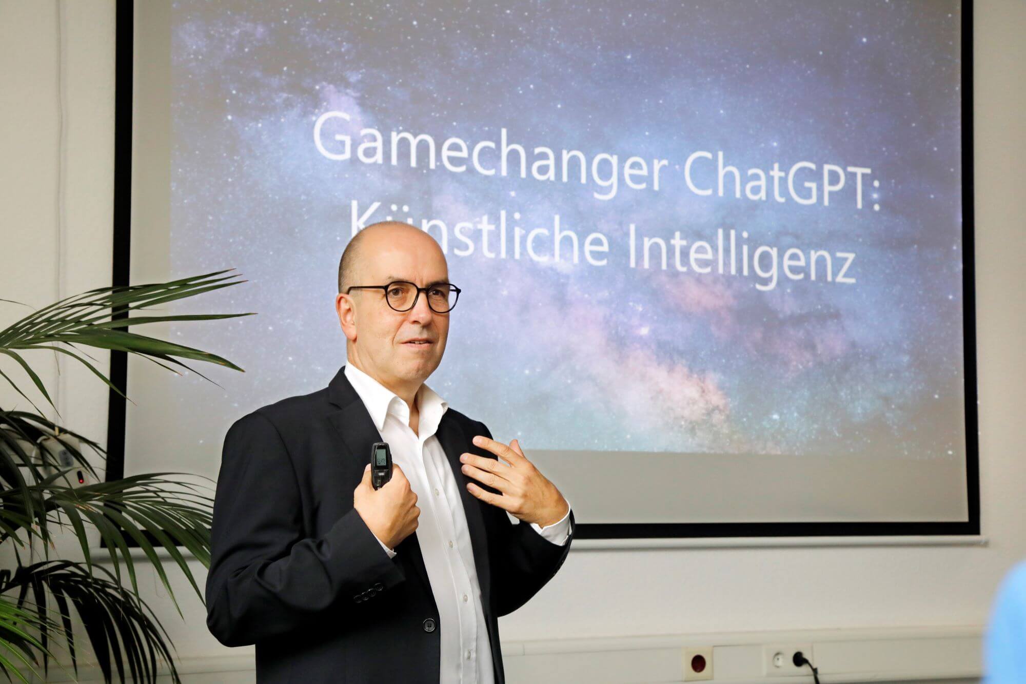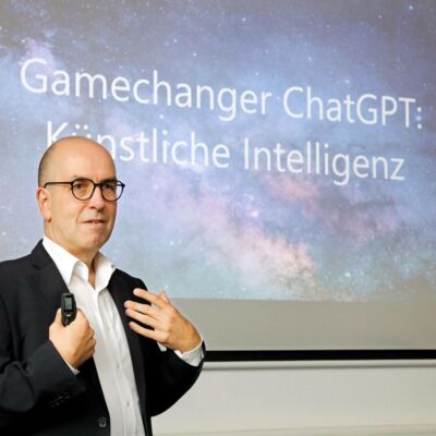 Dipl.-Päd. Lars Hahn, Geschäftsführer der LVQ Weiterbildung und Beratung GmbH aus Mülheim/Ruhr, referierte spannend und kenntnisreich über die Auswirkungen und Nutzungsmöglichkeiten von Künstlicher Intelligenz (KI) in der Arbeitswelt, bei der Jobsuche und Personalgewinnung. An Praxisbeispielen zeigte Lars Hahn auf, was das System ChatGPT, das erst ein knappes Jahr zum kostenlosen Testen am Markt ist, schon alles kann und was es „noch“ nicht kann. Die Notwendigkeit von Kenntnissen im Umgang mit KI, sich den Herausforderungen von KI zu stellen und die Chancen von KI optimal zu nutzen, wurde den Teilnehmerinnen und Teilnehmern eindrucksvoll nahegebracht.